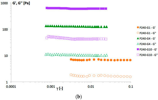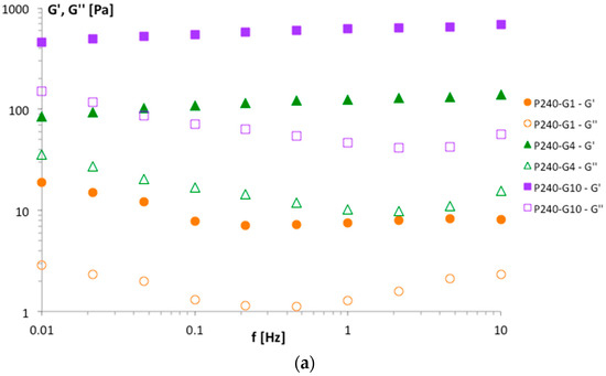 The values of the storage moduli, G’, of the P90G/GeCH mixtures (obtained at 1 Hz) reported in Figure 3 evidenced a trend in agreement with the viscosity data: increasing P90G and GeCH concentrations led to the formation of more rigid hybrid gels. Representative frequency sweep spectra of the samples P240-G1, P240-G4 and P240-G10 are reported in Figure 4. For these samples, a decrease in the phase lag values from 0.17, 0.08, and 0.07 for P240-G1, P240-G4, and P240-G10, respectively, was observed. This means that increasing amounts of GeCH led to the formation of more elastic materials; this effect could be ascribed to the formation of an increasing amount of cross-linking in the network due to an increase of the overall inter-particle interactions.