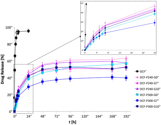 Release profiles of free DCF, DCF-loaded within the liposomes and DCF-loaded within the hybrid gels. Results were obtained through dialysis in water at 37 °C. Curves represent the release of DCF from: water solution, as control (black), P240 hybrid gels (P240-G0, P240-G7, and P240-G10 light pink, pink, and purple, respectively), and P300 hybrid gels (P300-G0, P300-G7, and P300-G10 light blue, blue, and dark blue, respectively).
