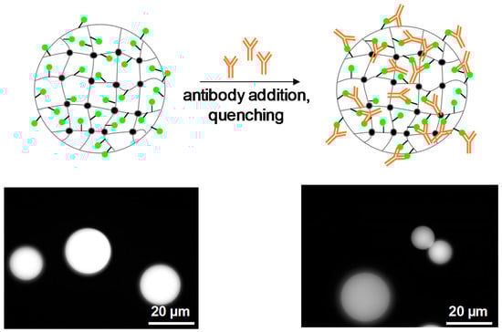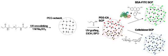 As outlined in Figure 2, SCPs with a hydrogel matrix were prepared by crosslinking of poly(ethylene glycol) (8 kDa) diacrylamide (PEG8kDa-dAAm) macromonomer droplets in 1 M Na2SO4 in water following previously established protocols []. For the two adhesion assays, antibody detection and soil release polymer characterization, two types of SCPs were prepared: antigen and cellobiose functionalized SCPs. In order to introduce coupling groups for the antigen and cellobiose for the adhesion assay, crotonic acid (CA) was grafted in the PEG-dAAm network under UV irradiation using benzophenone as active photophore [,]. Accordingly, PEG-CA SCPs with a CA functionalization degree on the order of 120 µmol CA per 1 g PEG-CA were obtained as measured via Toluidine blue O (TBO) titration.