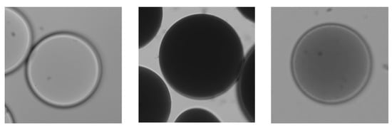 For the preparation of antigen functionalized systems, fluoresceinisothiocyanate (FITC) was chosen as a model antigen. In order to functionalize SCPs with FITC, we used bovine serum albumin (BSA) as a carrier. First, BSA was coupled to the SCPs by activating the CA groups with ethyl dimethylaminopropyl carbodiimide (EDC) and N-hydroxysuccinimide (NHS) before binding the protein to the SCPs. Then the SCPs were cleaned and directly reacted with FITC that binds to the nucleophilic amino acid side chains of BSA, resulting in BSA-FITC SCPs. Successful functionalization of the SCPs could be readily confirmed by fluorescence microscopy detecting the presence of FITC on the SCPs (Figure 3). For the preparation of cellobiose-functionalized systems mimicking cotton fabrics, PEG-CA SCPs were reacted with the carbodiimide, activating the carboxylic acid groups to then form an ester with cellobiose. The degree of cellobiose functionalization was measured by an additional titration step with toluidine blue that essentially yielded the reduction of carboxylic acids due to esterification upon cellobiose coupling. The conversion was on the order of 90%, i.e., functionalization degrees on the order of 100 µmol g−1 were achieved. Taking into account the molecular weight of PEG-dAAm chains of 8000 kDa, this means that circa 0.8 cellobiose units per macromonomer were bound to the SCPs. Successful functionalization could be additionally confirmed by optical microscopy, where the TBO-labeled PEG-CA SCPs show a strong blue color that becomes significantly less intense in the case of cellobiose SCPs (Figure 4), indicating cellobiose functionalization. The elastic modulus of the final SCPs was determined by AFM force-indentation measurements (Figure S1) and evaluation with a recently introduced model []. This model considers that the SCPs deform at the indenter site and the contact site with the solid substrate. The model further assumes linear elasticity, which is justified by the fact that the deformation during force indentation measurements does not exceed 0.2% with respect to the particle’s diameter. Both the BSA-FITC SCPs and cellobiose SCPs showed an elastic modulus of around 60 kPa.