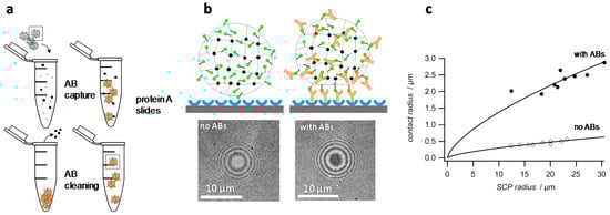 Procedure of the SCP adhesion assay. First BSA-FITC SCPs are incubated in antibody solution. Then they are cleaned by centrifugation and washing (a). Next, the SCPs adhesion is measured on protein A slided (b). The micrographs show images of an untreated (left) and antibody treated BSA-FITC SCP (right). After measurement of the contact area, the JKR plots reveal the adhesion energies of the SCPs (c). Note that drawings in (b) are not to scale and are presenting an idealized orientation of the binding partners for clarity.