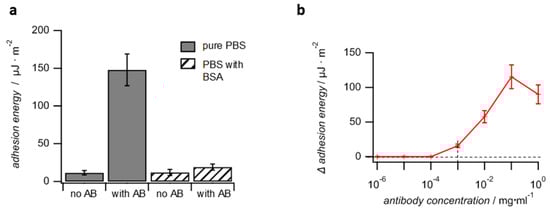 In another assay, the SCPs were charged with antibodies in presence of 50 mg mL−1 BSA to test the feasibility of SCP-based antibody detection from impure solutions (selectivity). The applied amount of BSA reflects typical concentrations of serum albumin in blood. Evaluation of the contact areas showed that the overall adhesion of antibody-containing SCPs was drastically reduced (factor of ten) as compared to SCPs charged with pure antibody solution. Nevertheless, the adhesion energies of SCPs prepared from antibody-containing solutions were still larger by a factor of two as compared to the negative control, SCPs treated with 50 mg mL−1 BSA solution containing no antibodies (Figure 6a). The significant reduction in adhesion when incubating the SCPs in presence of BSA is most likely due to non-specific binding of BSA to the SCPs, which then interferes with the specific antibody binding. Unfortunately, the mere use of PEG as carrier material for antigens is not sufficient in order to significantly reduce non-specific protein interaction, although PEG hydrogels are widely believed to be protein-repellent materials. Our finding is in line with recent studies showing that the protein-repellent properties attributed to PEG are in fact due to a protein corona that forms around PEG in blood []. This means that PEG does interact non-specifically with serum albumin. Therefore, in order to reduce non-specific interactions, treating the antigen/antibody surface with detergents like Tween® is still required as is also the case for classic affinity assays including ELISA and the like.