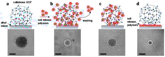Soil release polymers usually consist of two building blocks. The first one is the driver for the adsorption of the polymer on the textile, the second one provides hydrophilicity and prevents hydrophobic stains to deeply penetrate the fibers. For example, for polyester fabrics, common soil release polymers are polyesters of terephthalic acid, propylene glycol and poly(ethylene glycol). The polymer structure mimics the poly(ethylene terephthalate) (PET) garment chemistry while the PEG component hydrophilizes the surface []. On the other hand, for cotton textiles a copolymer consisting of a quaternary ammonium-bearing monomer and a neutral hydrophilic monomer would be better suited, where the cationic monomer acts as an anchor group for the slight anionically charged cotton fiber while the neutral comonomer provides hydrophilicity to the surface. To test the proposed mechanisms, three different experiments were conducted: (1) adhesion of cellobiose SCPs on hydrophobic surface in presence of soil release polymers in the solution (antiredeposition experiment, Figure 7b); (2) adhesion to the hydrophobic surface with cellobiose SCPs that were pre-treated and washed with soil release polymers. This experiment reflects the antiadhesive properties of soil release polymer coatings post washing (antiadhesive coating experiment, Figure 7c); (3) direct binding of cellobiose SCPs on soil release polymer surfaces (direct binding experiment, Figure 7d). A selection of the SCP adhesion data and JKR-evaluation is shown in Figure S2.