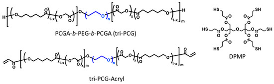 To address this problem, we recently reported the generation of biodegradable temperature-triggered covalent gelation systems exhibiting longer and controllable durations of the gel state by using a “mixing strategy” [14,15,16]. We synthesized a tri-block copolymer of poly(caprolactone-co-glycolic acid) (PCGA), poly(ethylene glycol) (PEG), PCGA-b-PEG-b-PCGA (tri-PCG), and tri-PCG with acryloyl groups attached at both termini (tri-PCG-Acryl) (Figure 1). A mixture of tri-PCG-Acryl micelle solution and tri-PCG micelle solution containing dipentaerythritolhexakis(3-mercaptopropionate) (DPMP) (Figure 1) as a hydrophobic hexa-functional polythiol exhibited an irreversible sol-to-gel transition by covalent cross-linking using a bio-orthogonal Michael-addition-type thiol-ene reaction in response to a temperature increase [15,16]. The mixed micelle solution remained in the sol state just after mixing at r.t., but underwent gelation in response to a temperature increase. Once formed, the hydrogel stayed in the gel state even after cooling. In this system, the acryloyl groups at the copolymer termini and the thiol groups of DPMP existed separately in different micelles just after mixing. Covalent bond formation between the acryloyl and thiol groups occurred only upon sol-to-gel transition induced by a temperature increase, since this temperature rise induced inter-micellar aggregation due to hydrophobic interactions, resulting in a physically cross-linked hydrogel. During the aggregation process, the micelle cores fused and subsequently the thiol groups of DPMP in the tri-PCG micelle core covalently cross-linked with the acryloyl groups via the Michael-addition-type thiol-ene reaction. This system existed for a longer and controllable duration time in the gel state. The duration time of the gel state after subcutaneous injection in vivo could be altered easily from 1 day to more than 60 days simply by changing the mixing ratio of DPMP/tri-PCG and tri-PCG-Acryl [15].