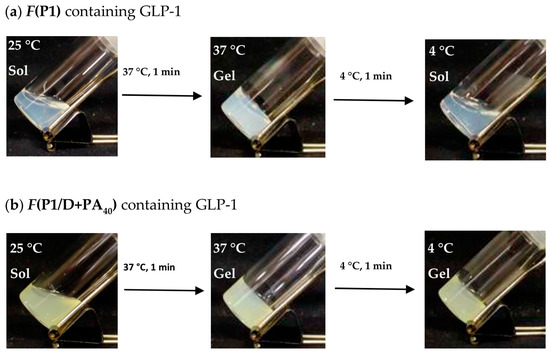 The sol-to-gel transition behavior of the F(P1/D+PA40) and F(P1) formulations containing GLP-1 are shown in Figure 2. Both formulations showed a sol-to-gel transition in response to a temperature increase from 25 to 37 °C. The presence of GLP-1 had almost no effects on the sol-to-gel transitions of these formulations (Figure S2), and the transition temperatures were between 25 and 37 °C. After cooling to 4 °C, F(P1) containing GLP-1 adopted the sol state, showing that the sol-to-gel transition was reversible. In contrast, F(P1/D+PA40) containing GLP-1 remained in the gel state after cooling, showing that the sol-to-gel transition was irreversible. These behaviors are in accordance with our earlier observations in the absence of GLP-1 [15]. Consequently, the presence of GLP-1 had no effect on the phase transition irreversibility of the formulation.