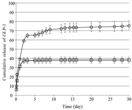 Cumulative release of GLP-1 (%) in vitro from F(P1) hydrogel containing GLP-1 (〇) and F(P1/D+PA40) hydrogel containing GLP-1 (□). The data are shown as the mean ± SD (n = 3).