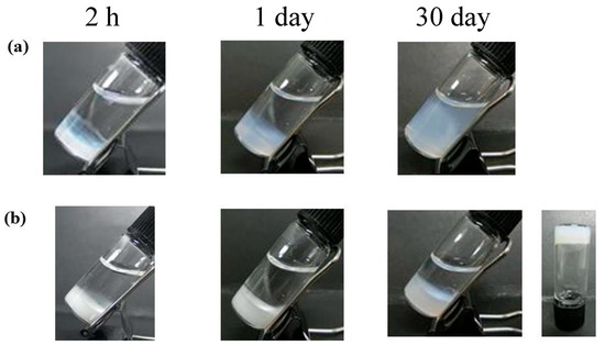 Photographs of (a) F(P1) hydrogel containing GLP-1 and (b) F(P1/D+PA40) hydrogel containing GLP-1 after heating at 37 °C for 1 min and subsequent cooling at 4 °C for 1 min.