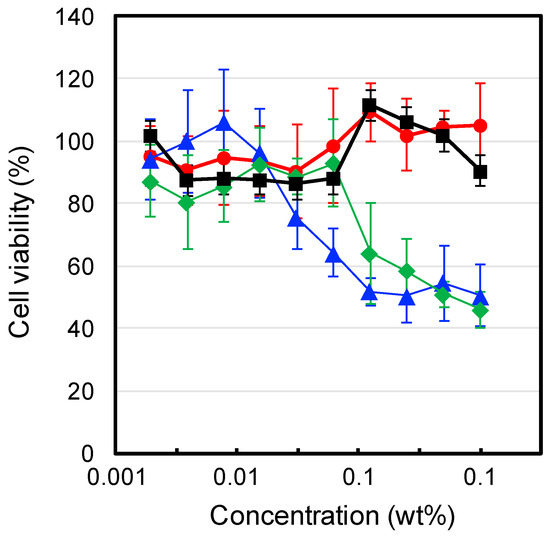 The viability of L929 mouse fibroblast cells after incubation with each sample for 24 h was investigated using a WST-8 assay (Dojindo, Tokyo, Japan). L929 mouse fibroblast cells (100 μL, 2.5 × 103 cells/well) in E-MEM containing 10% fetal bovine serum (FBS) were seeded in a 96-well microplate and cultured in a humidified atmosphere containing 5% CO2 at 37 °C. After preincubation for 24 h, all the medium supernatant was removed and added to 90 µL of fresh medium. Then, 10 µL of medium containing an IP formulation was added to each well and further incubated for 21 h. The medium supernatant was removed again from the wells, and the cells in the wells were washed with PBS twice. Thereafter, 90 μL of fresh medium and WST-8 reagent (10 μL) were added to the wells, and incubation was continued for a further 3 h. The microplates were read at 450 nm using a microplate reader. The average background absorbance from the control wells was subtracted from the sample data. The values for each sample were in the linear region of the standard curve for the WST-8 assay. Data are expressed as the means and SD (n = 6). Cell viability was calculated using the following equation: