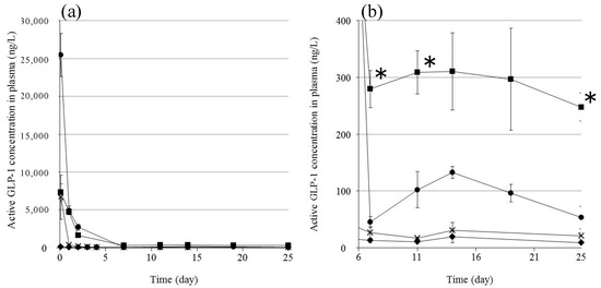 (a) Active GLP-1 concentration in plasma after subcutaneous injection for 25 days. (b) Magnification of the area between Days 6 and 25. GLP-1 solution (×), F(P1) containing GLP-1 (●), F(P1/D+PA40) containing GLP-1 (■), and F(P1/D+PA40) without GLP-1 (◆). The data are shown as the mean ± SD (n = 3–6). * p < 0.05 vs. F(P1) containing GLP-1.