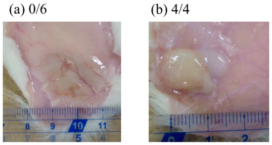 Photographs of hydrogels (a) F(P1), (b) F(P1/D+PA40) 25 days after subcutaneous injection in rats. The values indicate the number of rats harboring hydrogel/all rats.