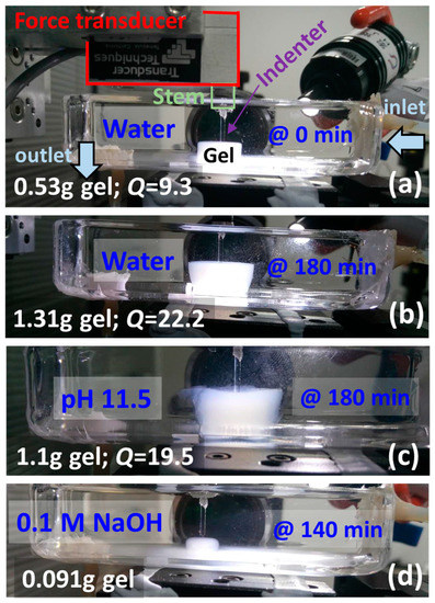 Experimental setup for the dynamic mechanical characterization of hydrogels by indentation. (a) Right after the gel is immersed in water, and (b) after 180 min; (c) in pH 11.5 after 180 min and (d) in 0.1 M NaOH after 140 min. The weight of the gels, as well as the calculated overall volumetric swelling degree Q, is also shown. Note that there is extensive dissolution in (d).