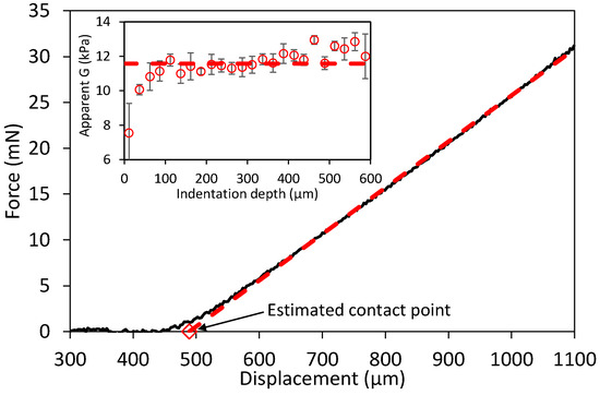 An example of an indentation of a whey protein isolate (WPI) hydrogel swollen from 3 min in water. The contact point is estimated by robust regression at large force values (dashed line), e.g., 6–31 mN here. The apparent shear modulus is then calculated using Equation (1) at different indentation depths at 25 μm intervals, shown in the inset, only for the purpose of checking the mechanical homogeneity of the indented layer. Error bars show the 95% CI of the fitted G. The dashed line in the inset is the average G between 50–500 μm.