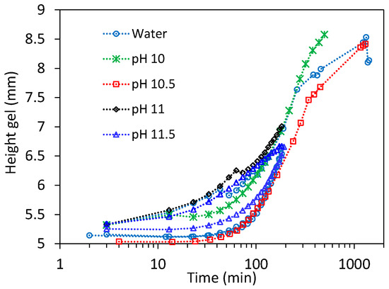Figure 3 shows how in several experiments performed at pH 7–11.5, when macroscopic dissolution is typically negligible, the gels’ height increase with time from a nominal value of 5 mm. These swelling kinetics are similar to those previously determined using different techniques [16], also showing substantial variability in repeated experiments (see for example water and pH 11.5 series in Figure 3).