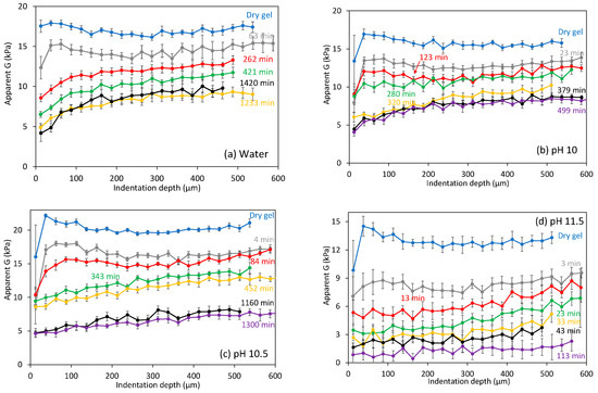 Calculated apparent shear modulus at different indentation depths in gels swollen at different conditions for different times. Dry gels refer to gel as prepared, i.e., before being submerged in solution. Points are the mean value of three indentations at different locations, error bars show the standard error. Note that as Equation (1) is only valid for homogeneous samples, G estimates with depth can only highlight qualitatively if substantial mechanical inhomogeneity occurs in the tested swollen layer.