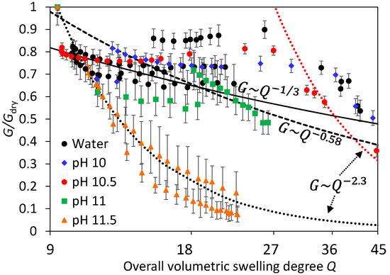 Swelling experiments at pH 11.5 were clearly different, the modulus decreases quickly and continuously up to values of the order of ~1 kPa, when intragel variability becomes relatively important. The major difference between pH 11.5 experiments and those at lower pH can be clearly observed by plotting the average shear modulus against the volumetric swelling ratio Q. One major limitation in these dynamic experiments is that it is currently not possible to quantify local Q values close to the surface. What is possible is to calculate the overall Q value from height measurements (Figure 3). With this important limitation in mind, which implies that surface Q values ought to be larger in these swelling experiments than the overall ones, G against Q is shown in Figure 5. In experiments using water or alkaline solutions at pH 10–11, it is observed a weak dependence of the modulus with the protein content that can be well represented, considering experimental variability and Q uncertainty, to scaling laws from the theory of rubber elasticity for flexible Gaussian chains [21,22], particularly at high crosslink densities [23]. Considering a general scaling relationship of the type G~Q−n, the value predicted for n depends on the solvent quality, at 1/3 for a Θ solvent and 0.58 for a good solvent [24], both predictions are shown in Figure 5. The reasonable agreement between the experimental data at pH 7–10 against rubber elasticity at low Q (<30) models suggests that chemical interactions within the gel network were stable, as in typical swelling experiments in polymer hydrogel.
