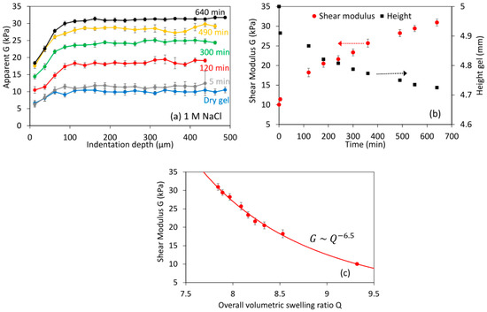 In addition to swelling experiments, the new apparatus was also tested in conditions where shrinkage occurred with time. Protein hydrogels shrink when decreasing the pH close to the isoelectic point (pI) of the protein, or as performed here by increasing the salts (e.g., NaCl) concentration at a constant pH [11]. The addition of salts reduces swelling due to the minimization of the electrostatic repulsion between the proteins that drives swelling at alkaline pH. Figure 6 shows an example using 1 M NaCl at a neutral pH. Indentation experiments did not show any gradient with depth at any time (Figure 6a), despite the fact that sodium chloride concentration [NaCl] gradients should be expected within the gel. The gel height decreased slightly with time, as expected, whereas the moduli increased substantially (Figure 6b). Correlating G against the overall Q results in an exponent n of −6.5 (Figure 6c). Note that the local Q values tested during indentation should be smaller than the overall Q in a shrinking experiment: this would reduce the fitted n. Such high n values can be caused if high [NaCl] reduces the solvent quality, leading to the collapse of the polymer chains as ν decreases to 1/3 [34]. Otherwise, this large n value may suggest that the gel network is strengthened with time. This behavior can also be expected from the literature: weak interactions (e.g., hydrophobic) in whey protein gels and aggregates are enhanced and stabilized at high salt concentrations [35].