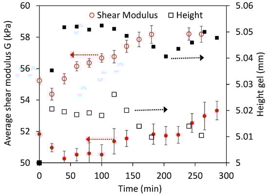 Shear modulus and height of particulate gels swollen in water (filled points) and in 0.1 M NaCl (empty points). Particulate gels were made with 0.1 M NaCl, heated at 80 °C for 1 h. Note that both the modulus and the height change little with time. Error bars are as in Figure 5.