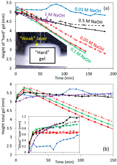 Height measurements at these [NaOH], when dissolution occurs, were different than in the previous swelling experiments. Two different heights were actually measured. The first one was that observed by the side microscope (Figure 1), referred as the total height (Figure 8b). However, no mechanical response was observed when indenting this layer until much deeper, resulting in a second height for the “hard” gel from indentation measurements. We refer, for simplicity, to the “weak” layer that is located in between the boundary observed by microscopy and by indentation. The Figure 8b inset shows that this weak layer could be quite substantial, for example, 0.5–1 mm, and was found to reach a constant value at 0.05 and 0.1 M NaOH, whereas at the other [NaOH] tested it continuously increased with time. Because of this, the decrease with time during dissolution of the total and “hard” heights gels were very similar at 0.05 and 0.1 M NaOH; whereas at the other [NaOH] the slight decrease in the “hard” height was compensated by the increase of the “weak” layer, resulting that the total height barely changed with time.