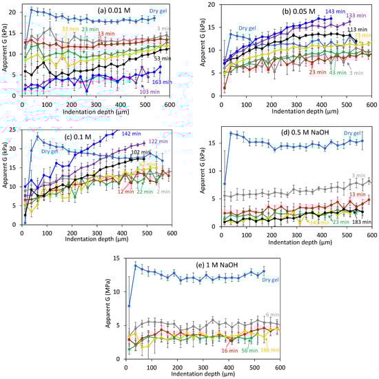The calculated shear modulus at different indentation depths is shown in Figure 9 at several representative times, but only for the “hard” mechanically responsive part of the gels. Results for 0.01 M NaOH (e.g., pH 12), Figure 9a, were similar to those at pH 11.5 (Figure 4d). Small G gradients were observed at long times when the average G values had already significantly decreased. Profiles for the 0.05 and 0.1 M NaOH experiments were markedly different: they decreased quickly from the initial dry conditions, showing a very clear gradient with the indentation depth unlike seen before. In addition, these profiles were very constant, typically up to <70 min, as shown in Figure 9b,c. At longer times, the shear moduli actually increased with time, but still showing very clear gradients. In fact, moduli higher than the values tested in the initial dry conditions were observed, although these values were still reasonable considering the variability of gels. Experiments at 0.5 and 1 M NaOH, Figure 9d,e, resulted in very different modulus profiles: G decreased very quickly, without apparent gradients with the indentation depth, until very small G values were obtained, which became constant with time.