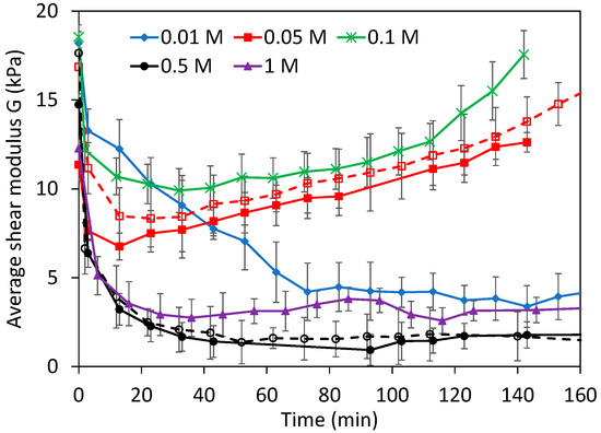 Dynamic effects are better observed in Figure 10 considering the average G. Experiments at 0.05 and 0.1 M NaOH, when dissolution is faster, clearly presented much higher moduli than when dissolution was slow. Interestingly, in all experiments where the average moduli are constant with time, the dissolution rates are also known to be constant [3]. Constant dissolution rates imply that the system has reached a steady state, with should also be observed on the swollen/degraded hydrogel next to the solution boundary tested here, for example, the local Q profile, the degree of chemical degradation, and so on. The constant moduli should be the consequence of the steady-state swollen layer, despite the fact extensive dissolution occurs. The depths indented at <500 μm here were relevant to test the swollen layer because the constant penetration depth of the NaOH, where the pH > 9.8, was around ~1 mm [36]. From these initial experiments, we can conclude an apparently contradicting observation: the swollen layer is harder in conditions where chemical dissolution is faster.