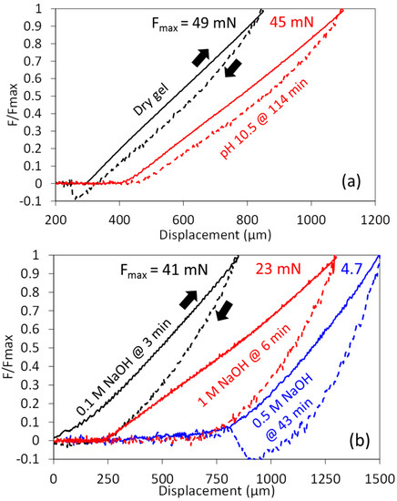 Experiments at high [NaOH] yielded very different results, as shown in Figure 11b. Even in the earliest measurements performed, typically after ~3 min of being submerged in solution, the hysteresis was substantially larger than before. The elastic recovery also decreased markedly, for the data shown in Figure 11b it is ~70% at 0.1 M NaOH, and ~56% at 0.5–1 M NaOH. Clearly, this is related to the destruction of the elastic gel network by the alkali, and this information should be useful to quantify the destruction of the chemical interactions from a mechanical point of view. Finally, adhesion between the indenter and the hydrogel was also observed in many measurements, particularly during dissolution, as inferred from the negative force values during the unloading step. Adhesion forces were relatively large for the dissolution experiments in 0.5 M NaOH, as shown in Figure 11b, due to the very small shear modulus.