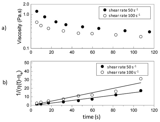 A typical schematic thixotropic behavior of a rheological time dependent gel after the application of constant shear rates of 50 1/s and 100 1/s is depicted in Figure 1a. By integrating Equation (6) between t = 0 and an arbitrary time t, the following equation is obtained: