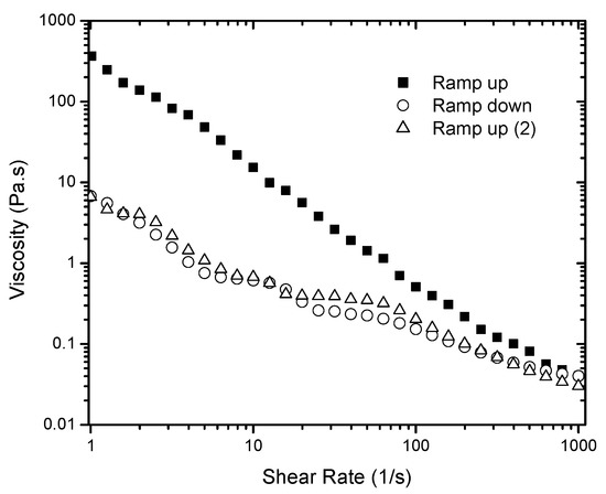 Viscosity measurements of 6% gel. Three runs were carried out using the same sample: shear rate was increased from 1 to 1000 s−1 (ramp up), varied from 1000 to 1 s−1 (ramp down), and increased from 1 to 1000 s−1 (ramp up 2).