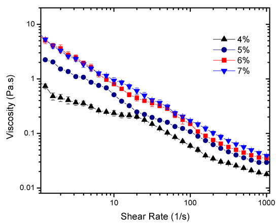 Viscosity (mean) as a function of shear rate for 4%, 5%, 6%, and 7% gels. These curves describe the flow behavior of the sheared and time independent fluid. The Extended Herschel-Bulkley model was applied to describe the flow characteristics of the gels. Measurements were carried out in triplicate. Error bars shown in the plot were calculated using a 95% confidence interval determined with the software OriginPro 2016 (OriginLab Corporation, Northampton, MA, USA).