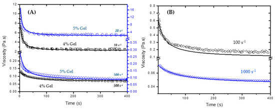 Experimental and fitted viscosity values for 4% and 5% silica gels are depicted in Figure 7A for two shear rates (10 and 500 s−1). The measured data shows good agreement with the fitted curve obtained by the approach developed in this work at high and low shear rates. For these curves, λe was obtained from the viscosity measurements as a function of time for different shear rates. It is important to mention that for high shear rates, the equilibrium viscosity reaches values close to those provided by the flow curve of the broken gel (Extended HB Model), which implies that λe is close to 1. In practice, the application of constant high shear rates for long times is also able to completely break down the 3D network formed by the colloidal particles. In this case, when λe = 1, Equation (4) is simplified to:
