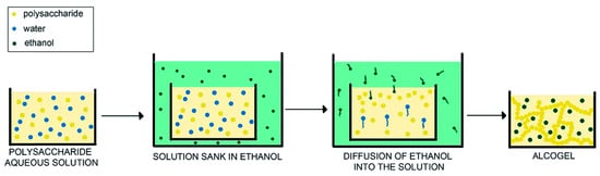 In the last thirty years, the non-solvents properties of organic solvents have been utilized for “hardening” of alginate and pectin hydrogel microparticles prepared by emulsion gelation [22,23]. In this context, it is important to mention the work by Oakenfull and Scott [24], who demonstrated that the gel network of high methoxyl pectin prepared in the presence of ethanol and tert-butanol is stabilized by a combination of hydrogen bonds and hydrophobic interactions. The latter are strengthened by the alcohols contributing about half to the free energy of formation of junction zones.