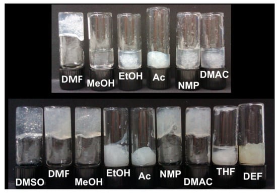 Effect of addition of 1 mL of solvents to 1 mL of 2% w/v (upper panel) or 4% w/v (lower panel) sodium alginate aqueous solution. Solvents used: dimethyl sulfoxide (DMSO), dimethylformamide (DMF), dimethylacetamide (DMAC), N-methyl-2-pyrrolidone (NMP), diethylformamide (DEF), tetrahydrofuran (THF), acetone (Ac), methanol (MeOH) and ethanol (EtOH). Reprinted with permission from Pérez-Madrigal et al. [31]. Copyright (2017), American Chemical Society.
