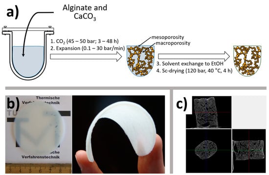 (a) general scheme of the carbon dioxide induced gelation; (b) as synthesized translucent monolithic alginate aerogel from 0.5 wt % sodium alginate solution (left panel), alginate aerogel after compression under a pressure of 10 kN/m2 becomes flexible; (c) microtomography image of alginate–lignin aerogels produced by CO2 induced gelation depressurized at 30 bar/min to introduce macropores. Part (a) is reprinted from Martins et al. [42], Copyright (2015), with permission from Elsevier; part (b) is reproduced from Gurikov et al. [39] with permission from the Royal Society of Chemistry; part (c) is reprinted from Quraishi et al. [43], Copyright (2015), with permission from Elsevier.