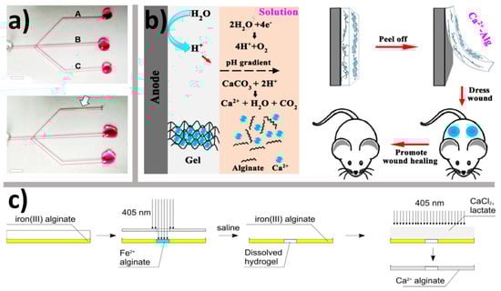 (a) localized flow-blocking by UV induced gelation of alginate; upper panel: the fluid flows freely through all three channels (A, B and C); lower panel: gel is formed (indicated by arrow) in the channel A upon UV exposure; (b) electrodeposition of calcium-crosslinked alginate film triggered by the release of Ca2+ ions from insoluble CaCO3 particles; (c) preparation of patterned calcium crosslinked alginate hydrogel by photochemical patterning of iron (III) crosslinked alginate hydrogel, dissolution of the exposed areas and photochemical reductive cation exchange. See text for details. Part (a) is adapted with permission from Oh et al. [49], Copyright (2016), American Chemical Society; part (b) is reproduced by permission from Liu et al. [50], Copyright (2017), Springer Nature; part (c) is adapted from Bruchet and Melman [51], Copyright (2015), with permission from Elsevier.