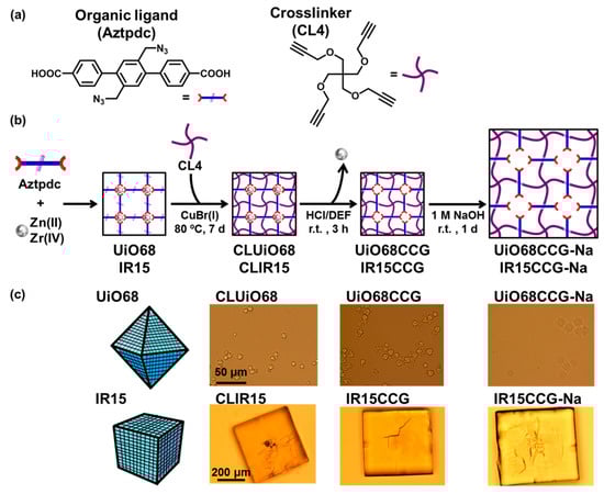 (a) Molecular structures of the reactive organic ligand Aztpdc and crosslinker CL4; (b) Schematic image of preparation route for CCG-Nas (UiOCCG-Na and IR15CCG-Na); (c) Appearance of crosslinked MOFs (CLUiO68 and CLIR15), CCGs (UiO68CCG and IR15CCG), and CCG-Nas (UiOCCG-Na and IR15CCG-Na).