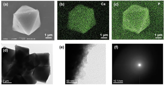 Scanning electron microscopy (SEM) revealed the well-defined regular octahedron shape of UiO68CCG-Na@CP with ~5 μm side length after deposition of calcium phosphate (Figure 2a). Energy dispersive X-ray spectrometry (EDX) analysis showed the presence of Ca and P atoms in the whole area of the particle of UiO68CCG-Na@CP (Figure 2b,c). The deposited calcium phosphate mainly existed at the vicinity of particle’s surface, shown by line analysis of EDX (Figure S2a). The abundant carboxylate groups inside CCG-Na effectively prevented the penetration of phosphate anion to the core of CCG-Na, while cationic Ca2+ would be distributed in the whole range of the particle (Figure S2). Transmission electron microscopy (TEM) also confirmed the regular octahedron shape of the particle and the deposition of calcium phosphate on the surface (Figure 2d,e). No distinct patterns were observed in selected area electron diffraction (SAED) analyses, indicating the amorphous nature of the deposited calcium phosphate (Figure 2f).