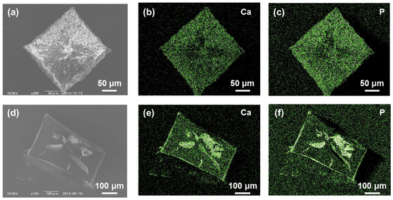 As with the case of UiO68CCG-Na, the deposition of calcium phosphate on IR15CCG-Na (IR15CCG-Na@CP) was achieved while keeping the cubic shape of the original CCG-Na, as shown in Figure 1a. EDX analysis showed the full distribution of Ca and P atoms in the whole area of the particle of IR15CCG-Na@CP (Figure 3b,c). The deposition of calcium phosphate occurred mainly in the vicinity of surface and cracks, indicated by the EDX analyses of cross-sections (Figure 3d–f). Powder X-ray diffraction showed no obvious patterns (confirming the amorphous nature of the deposited calcium phosphate).
