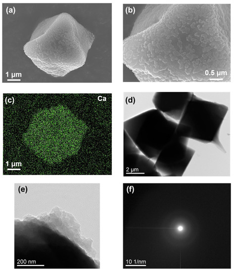 (a) SEM image of calcium carbonate deposited on UiO68CCG-Na (UiO68CCG-Na@CC); (b) Magnified SEM image from image (a); (c) EDX mapping of Ca atoms for image (a); (d) TEM image of UiO68CCG-Na@CC; (e) the magnified image; and (f) SAED observation from image (e).