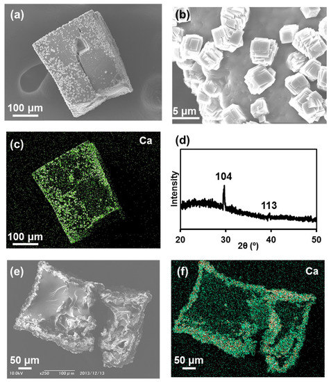 Recently, we have developed a new methodology to obtain polymer gels with well-defined structures derived from template crystals, the crystal crosslinking method [24,25,26,27,28,29]. The method involves the post synthetic modification (PSM) of metal-organic frameworks (MOF); the resulting crystal crosslinking gels (CCGs) possessed a polyhedral shape derived from the original MOF crystals. Additionally, after the hydrolysis of crosslinked MOFs for removal of metal cations, abundant carboxylate groups remained inside the CCGs, which was shown using the absorption test for metal cations [29]. The abundant carboxylate groups in a CCG can attract other metal cations such as Ca2+, thus the later deposition of inorganic salts will occur around the carboxylate groups in the CCG. In this study, we demonstrated the deposition of inorganic salts such as calcium carbonate and calcium phosphate by using CCG as the shape-directing agent. The deposited inorganic salts should possess a well-defined shape derived from the employed CCG, and therefore from the original MOF crystal.