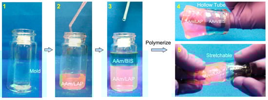 We then leave the system to polymerize at room temperature. Afterward, the gel is removed from the mold and is shown to be a hollow tube with a diameter of ~25 mm, length of ~50 mm and a wall thickness of ~ 5 mm (Panel 4). Note that the inner vial diameter dictates the wall thickness and the outer vial diameter dictates the outer diameter of the tube. The tube shows well-separated regions of the two gels, i.e., AAm/LAP is the pink zone and AAm/BIS is the colorless zone. As expected, the zone that is cross-linked by LAP is more compliant and stretchable than the adjacent zone that is cross-linked by BIS (Panel 5) [1,18]. Note that the LAP serves as chemical cross-linkers here: i.e., when AAm monomers and LAP particles are in the presence of free-radicals generated by the initiator, polymer chains of AAm are induced to grow from the surfaces of LAP particles [18,19]. The higher stretchability of LAP gels is believed to be because the chain segments between adjacent particles (i.e., cross-links) are longer than in a conventional BIS cross-linked gel [1,16].