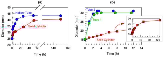 How does the rate of swelling compare between solid and hollow cylinders? To study this, we made gels in the form of solid cylinders and hollow tubes with the same monomer composition (both gels were not hybrids). The monomer was a mixture of AAm (nonionic) and 2-(dimethylamino)ethyl methacrylate (DMEM) (cationic), with the AAm:DMEM molar ratio fixed at 90:10. The total monomer content was 1 M and the cross-linker was 0.1% BIS. Due to its ionic nature, a gel with this composition is expected to swell significantly in water at pH 7 [5,6]. Figure 2 shows two comparisons of solid and hollow cylinders, which were each placed in a reservoir of water at time t = 0. In Figure 2a, the two cylinders have an outer diameter of 25 mm and a length of 50 mm, with the wall thickness of the hollow tube being 5 mm. The solid cylinder swells to a diameter of 40.5 mm in about 150 h. The hollow tube swells to a slightly larger diameter of 43.4 mm, but more importantly in only about 50 h, i.e., in one-third the time. In Figure 2b, the three cylinders all have an outer diameter of 15 mm and a length of 40 mm. Two hollow tubes are studied, with wall thicknesses of 1.8 and 1.2 mm, respectively. The two tubes swell to a diameter of ~30 mm within about 4 h. The solid cylinder, on the other hand, swells to a slightly lower diameter of 28.4 mm, but takes more than 120 h to do so (30-fold longer).