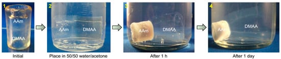 Next, we studied a hybrid tube that is responsive to solvent composition (Figure 4). In this case, the hybrid has two zones, one of 1 M AAm cross-linked with 3% LAP and another of 1 M DMAA cross-linked with 4% LAP (Panel 1). It is known that AAm gels shrink in water containing acetone above a critical level (~50%) whereas DMAA gels are not sensitive to acetone [5,6]. This behavior derives from the fact that poly(AAm) chains are soluble in water but insoluble in acetone. We placed the AAm/DMAA hybrid tube in a 50/50 acetone/water solution at room temperature (Panel 2). As shown by Panels 3 and 4, the AAm zone shrinks and turns opaque, while the DMAA zone slowly starts swelling to absorb the solvent. After a day, the AAm zone is considerably smaller than its initial size while the DMAA portion is swollen appreciably. Thus, the initial tube is transformed into a funnel shape with a significant difference in diameter between the two zones. This shape change can be reversed by placing the tube back in water.