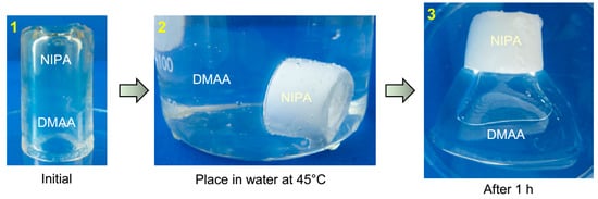 We then explored a temperature-responsive hybrid tube (Figure 5). This again had two zones, one of 1 M N-isopropylacrylamide (NIPA) cross-linked with LAP (3%) and another of 1 M DMAA cross-linked with LAP (4%) (Panel 1). NIPA gels are known to be thermo-responsive: specifically, they shrink when heated above their lower-critical solution temperature (LCST), which is 32 °C [5,6]. DMAA gels, in contrast, are not responsive to temperature. Panels 2 and 3 show the result of placing the NIPA/DMAA tube in hot water (~45 °C), above the LCST of NIPA. The NIPA zone turns opaque and shrinks, whereas the DMAA zone remains clear and expands slightly. Thus, the tube is again transformed into a funnel shape. On placing the gel back in water at room temperature (23 °C, below the LCST of NIPA), the NIPA portion reverts to its initial clear state and the gel recovers its symmetric tubular shape.
