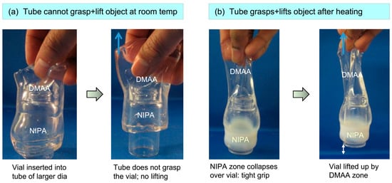 Grasping an object using a shape-changing gel tube. The tube has two zones: DMAA and NIPA, of which only the latter is responsive to temperature. (a) A vial of slightly smaller diameter is inserted into the tube. The tube does not tightly grasp the vial; therefore, when the tube is lifted up, it slides over and does not pull up the vial. (b) When the vial/tube combination is immersed in hot (50 °C) water, the NIPA zone of the tube contracts and collapses around the vial, thereby exerting a tight grip. When the tube is lifted up by its free DMAA portion, the vial can now be picked up along with the tube. The photo on the right shows that the vial has been lifted off the surface.