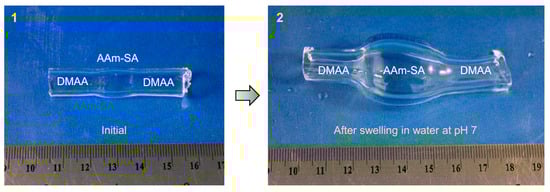 Shape changes in a three-zone hybrid gel tube induced by pH. (1) The initial as-made tube has three zones: a central zone of AAm:SA 90:10 that is pH-responsive due to the anionic SA, and two zones flanking this that are made from the nonionic DMAA. The diameter is uniform across the three zones. (2) After swelling in water at pH 7 for more than a day, the tube is removed and photographed. A ruler is shown in both photos for size comparison. The photo shows that the middle ionic zone is significantly expanded in both diameter and length compared to its initial size and compared to the adjacent nonionic zones. Thus, there is a distinct change in the shape of the hybrid tube.