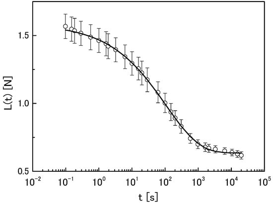 The time profile of the change in the compression load of agarose gel (1.5 wt %) is shown in Figure 1. The compression load decreased exponentially with time, but did not relax completely, reaching a plateau after 104 s. We analysed this relaxation behaviour using a stretched exponential function (Equation (1)):