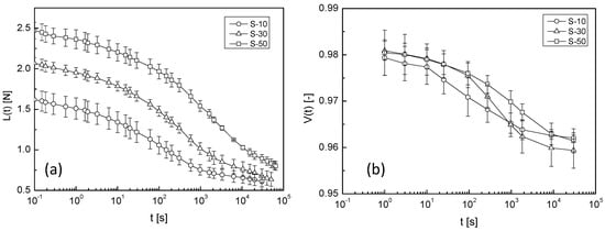 The compression load change and volume change in samples containing sucrose are shown in Figure 3a,b, respectively. The compression load increased with increasing sucrose concentration, as clearly shown in Figure 3a. Furthermore, the relaxation time appeared to increase with increasing sucrose concentration.