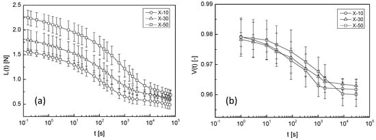 Time profile of (a) compression load and (b) volume change in samples containing xylitol. Circles, triangles, and squares denote X-10, X-30, and X-50 samples, respectively. Error bars represent the standard deviation. The lines are an eye-guide.