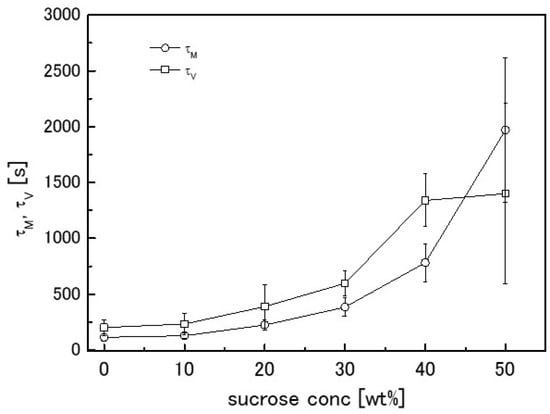 Dependence of time constants τM (circles) and τV (squares) on sucrose concentration. Error bars represent the standard deviation.