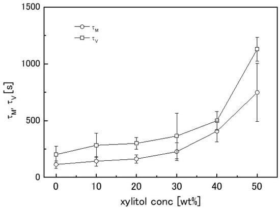 Dependence of time constants τM (circles) and τV (squares) on xylitol concentration. Error bars represent the standard deviation.
