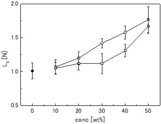 Gel strength (L0 in Equation (1)) of samples containing various sweetener concentrations. Closed circles, open circles, and open squares denote the control (1.5-wt % agarose), sucrose series, and xylitol series, respectively.